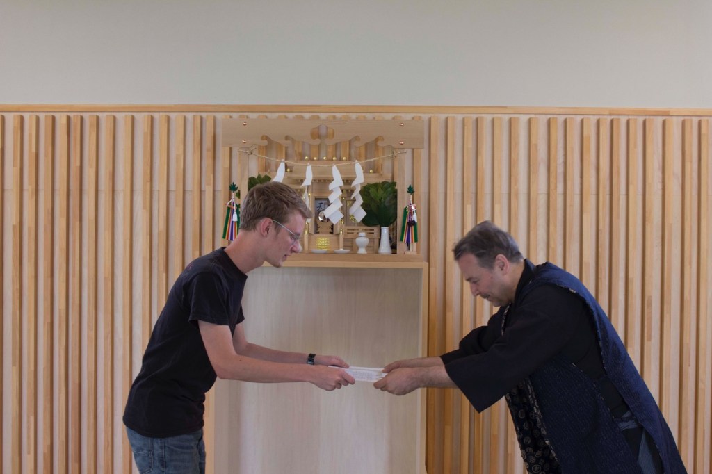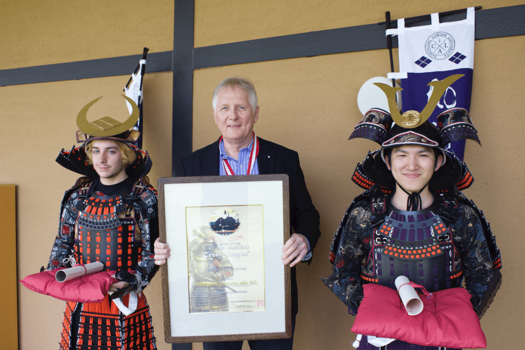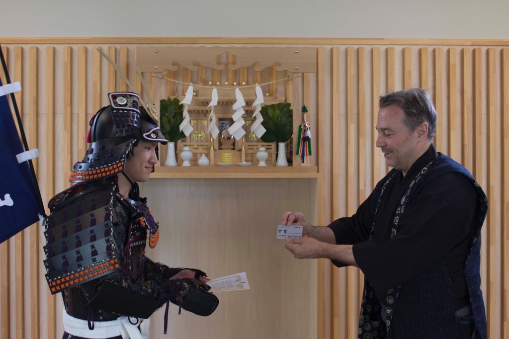 Darren Ashmore (Shogun) ceremoniously presents Shogun Awards on behalf of Ronnie Watt OBE ORS (9th dan) to Michael Laktorin and William Reed.