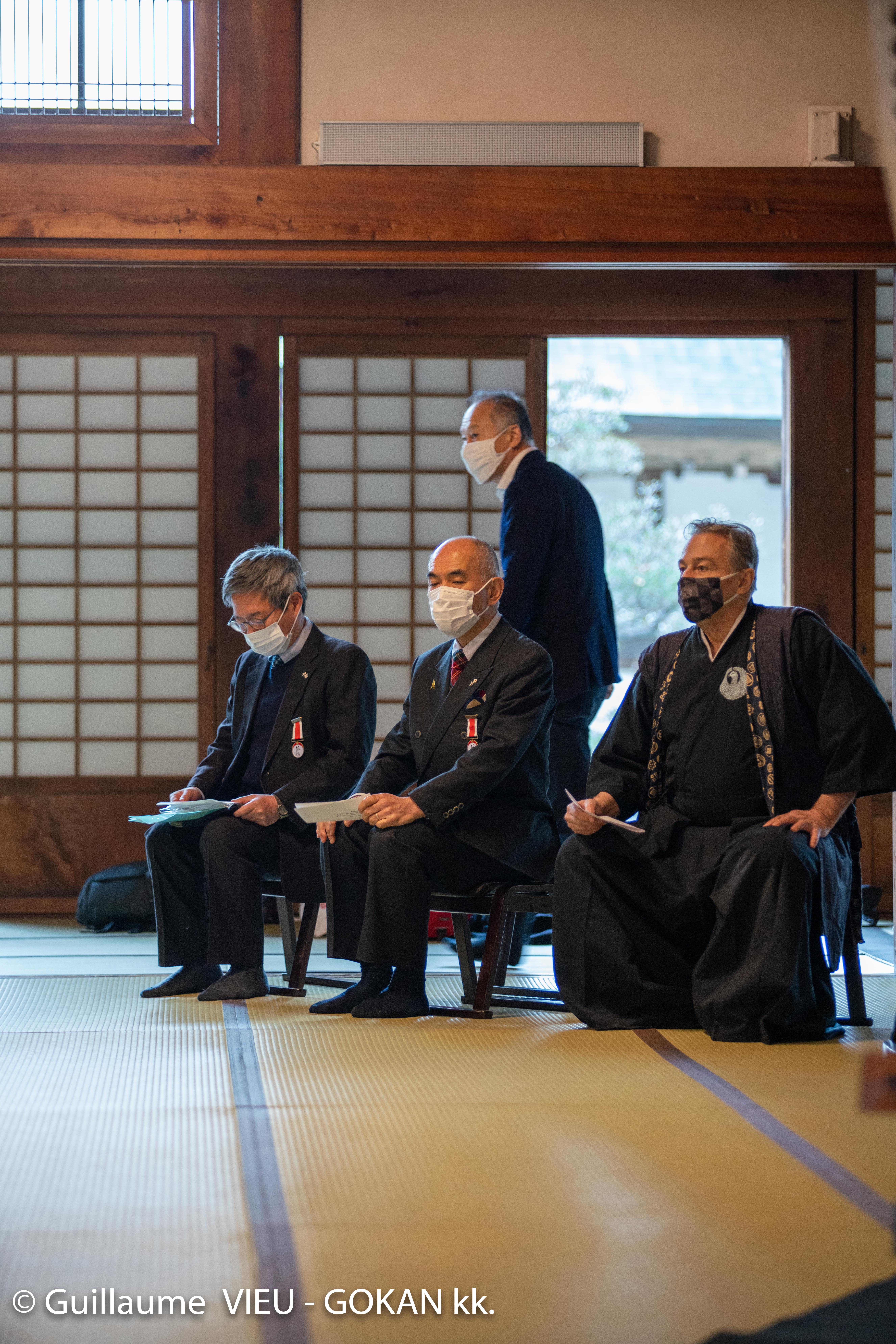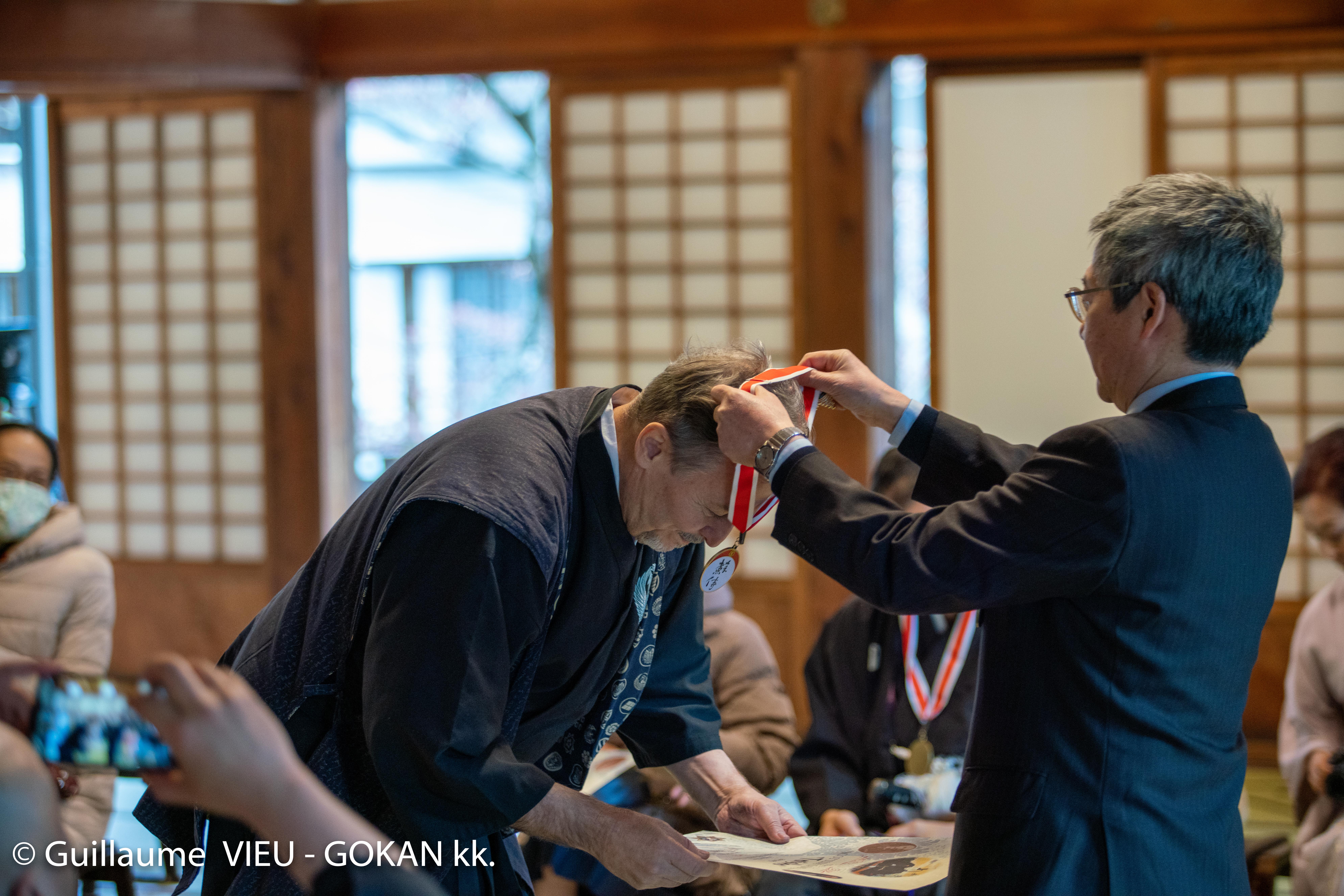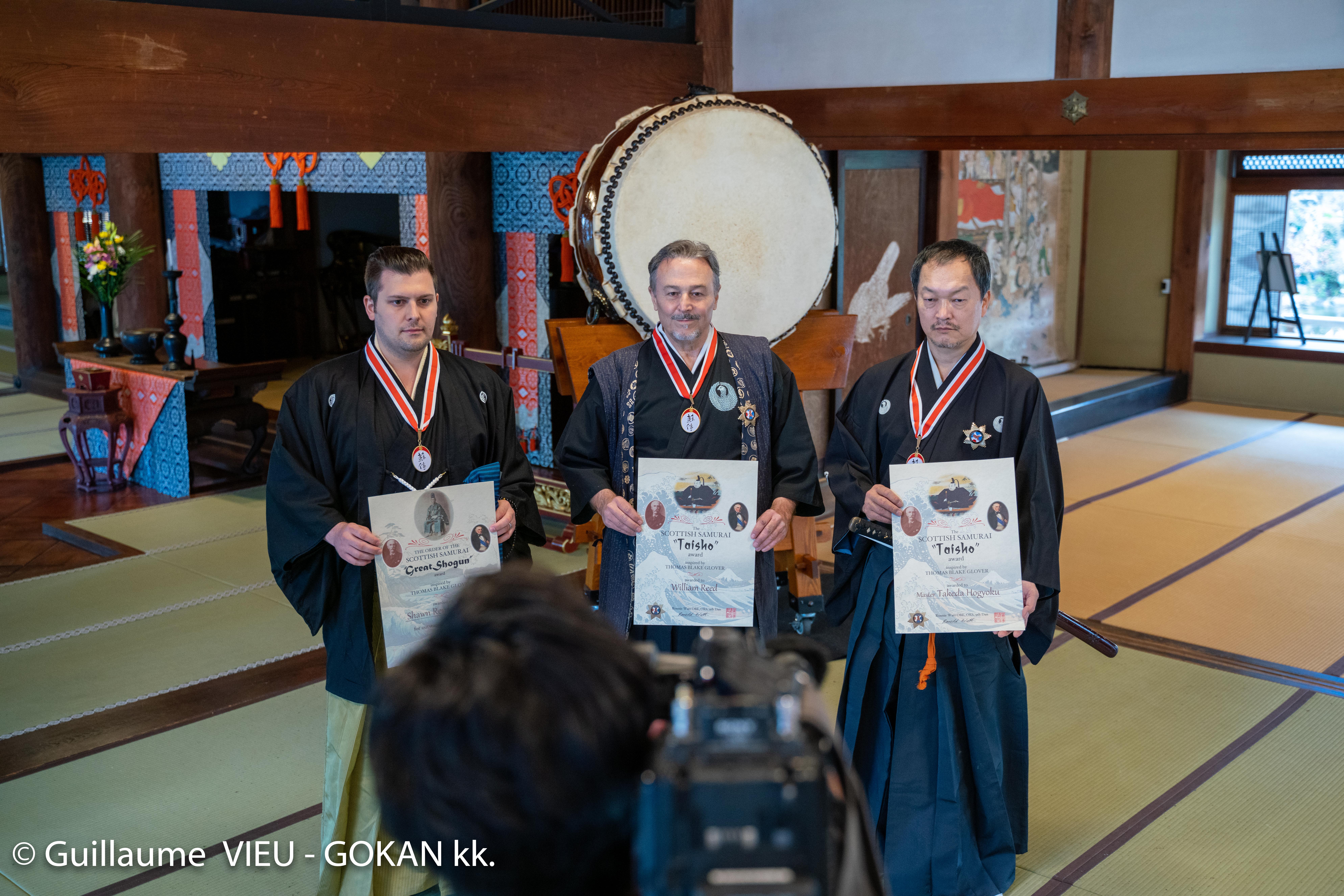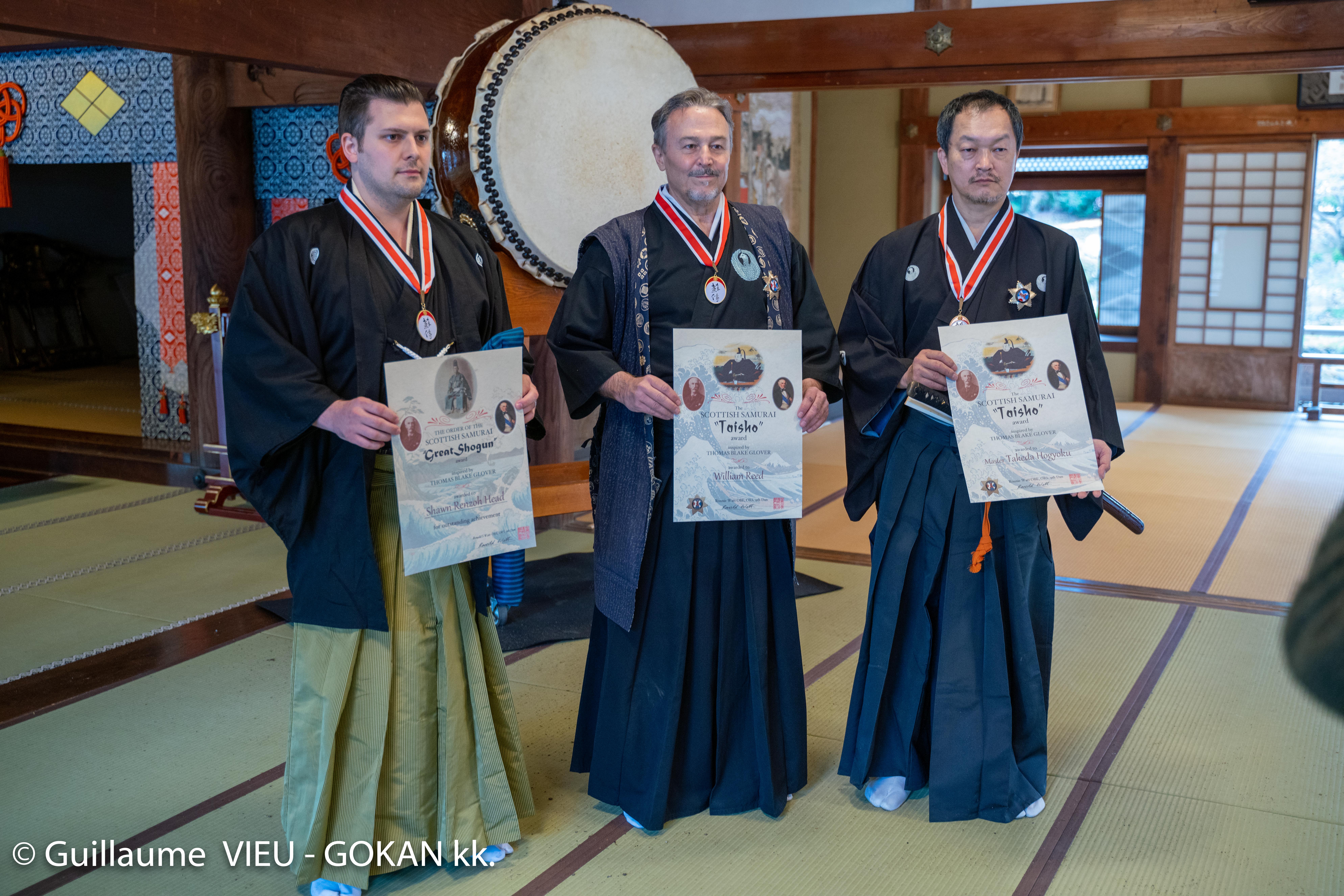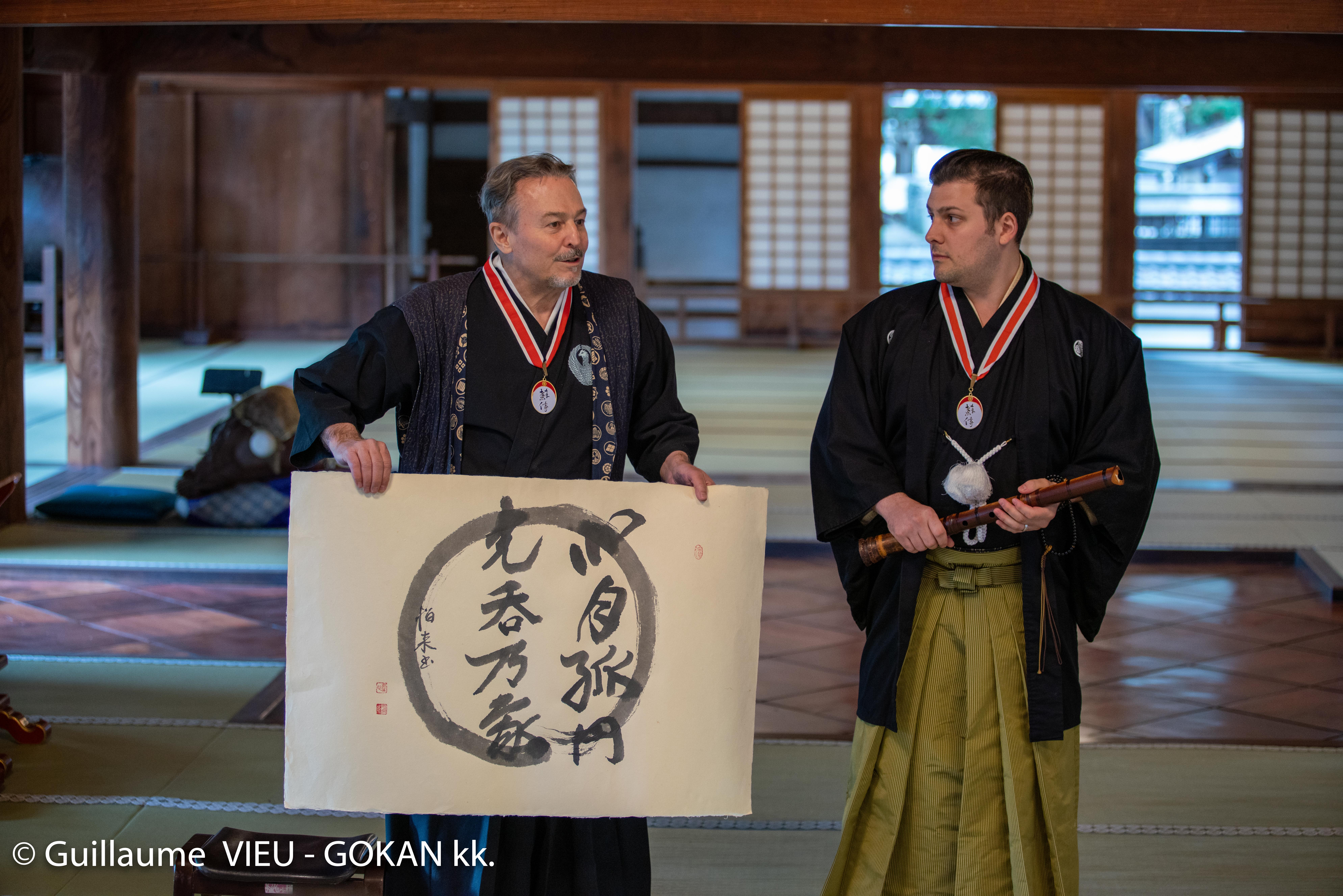 This year in Japan the Scottish Samurai Awards Ceremony was held at historic Erinji Temple (founded in 1380) in Yamanashi Prefecture on December 14, 2020, in correspondence to the 109th Anniversary of the passing of Thomas Blake Glover on December 16, 1911. We held the Scottish Samurai Awards Ceremony once before at Erinji in the fall of 2018, which was attended by Lord Charles Bruce, Ronnie Watt, and over a dozen members of the Scottish Samurai Japan Tour from Scotland. This year in 2020 it was presided over by Matsunaga Daisuke, former Consul General to Scotland, who delivered a speech in English and Japanese recognizing the importance of the event, as well as by Kendo Master Yamazaki Kazuo. Words of Congratulations were presented from Ronnie Watt and read by William Reed. The Ceremony included a breathtaking demonstration of the Sword by Mugairyu Master Takeda Hougyoku, a performance of the Japanese Taiko Drum Master Sato Kensaku, and a collaborative performance of calligraphy with William Reed involving Shakuhachi Player Shawn Renzoh Head. Furukawa Shuken, the Zen Master of Erinji Temple, spoke at the Ceremony and graciously opened up the entire temple to our use for the Awards. The event was covered by Yamanashi Broadcasting System’s program Tetete TV, which is viewed throughout the Prefecture.