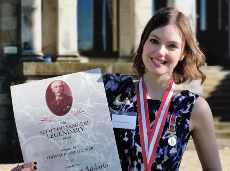 Dr Tanita Louise Addario was born in Aberdeen in 1989 and attended Kittybrewster Primary School, St Machar Academy and received a scholarship to undertake a PhD in Sociology (2018), after completing her MSc in Sociology (with distinction) and MA in Anthropology (first class honours) at the University of Aberdeen. Throughout her studies, Tanita has published research on the role of libraries in communities and has presented her PhD findings at national and international conferences. In 2012, Tanita received the Thomas Glover Scholarship and represented Aberdeen and the Rotary Club of Balgownie in Nagasaki, Japan, following in the footsteps of the influential Thomas Blake Glover. More recently, she has spoken at a Topical Talk meeting in Kaimhill about the life and legacy of Thomas Blake Glover and will be visiting Japan in summer 2019. Tanita is keen to continue to promote friendship and communication between our two cultures.